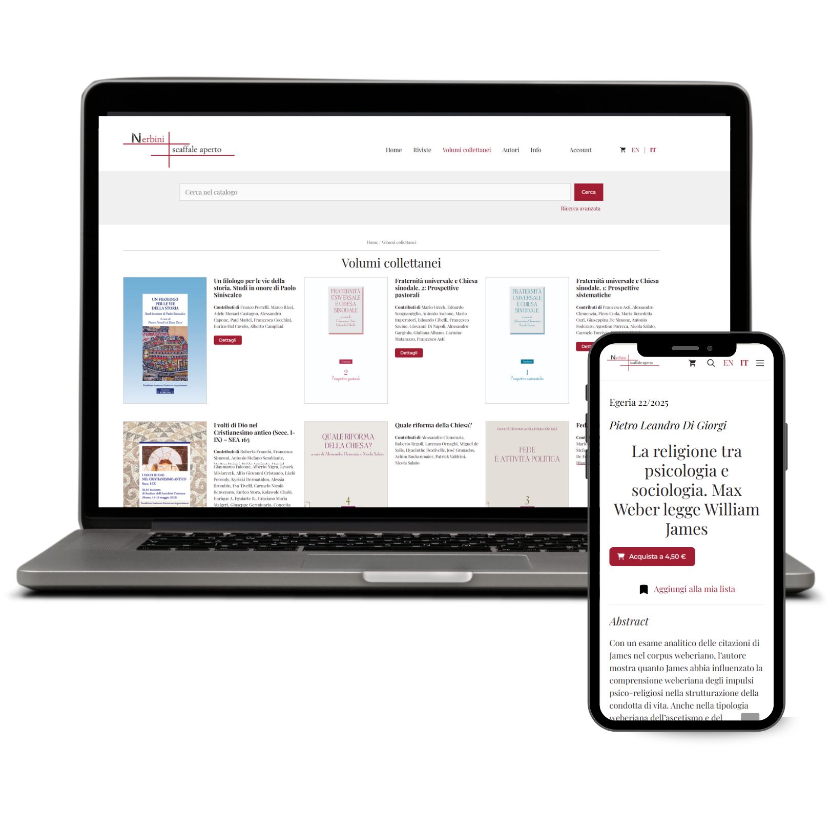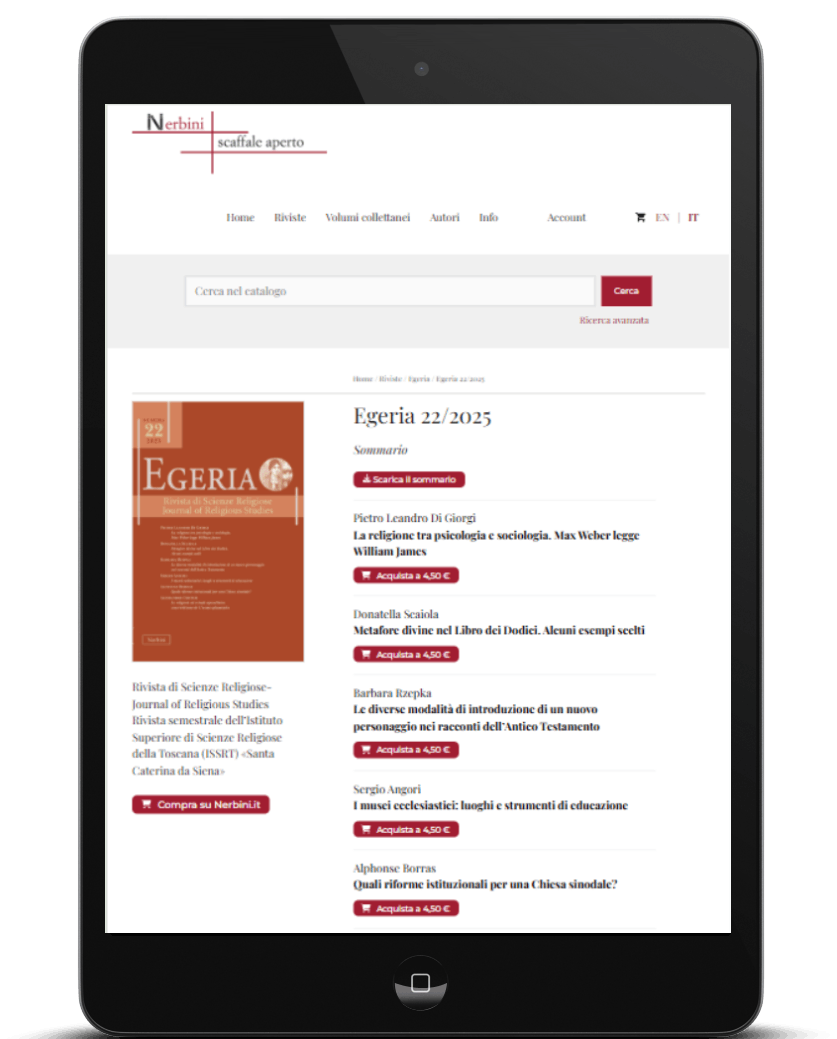 Questo ecosistema digitale è stato progettato per servire al meglio studiosi e lettori. Consente di accedere ai contenuti sia in modalità open access, sia attraverso un processo di acquisto semplice e rapido. La piattaforma è multilingua (italiano e inglese) e viene gestita in piena autonomia dal cliente, garantendo flessibilità e controllo.